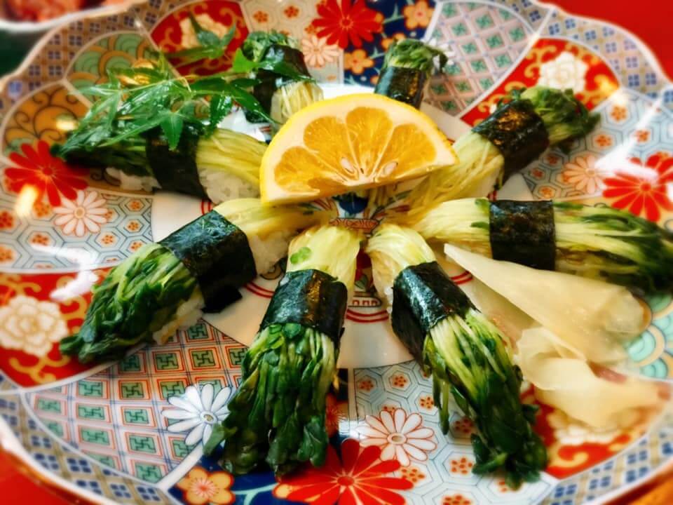 地元の山菜をトッピングしたヘルシーな「山菜寿司」も、佐伯ならではの味わいとして人気です。銀粒米は水素水で炊き上げられ、ふっくらとした食感が魚介の旨みを引き立てます。